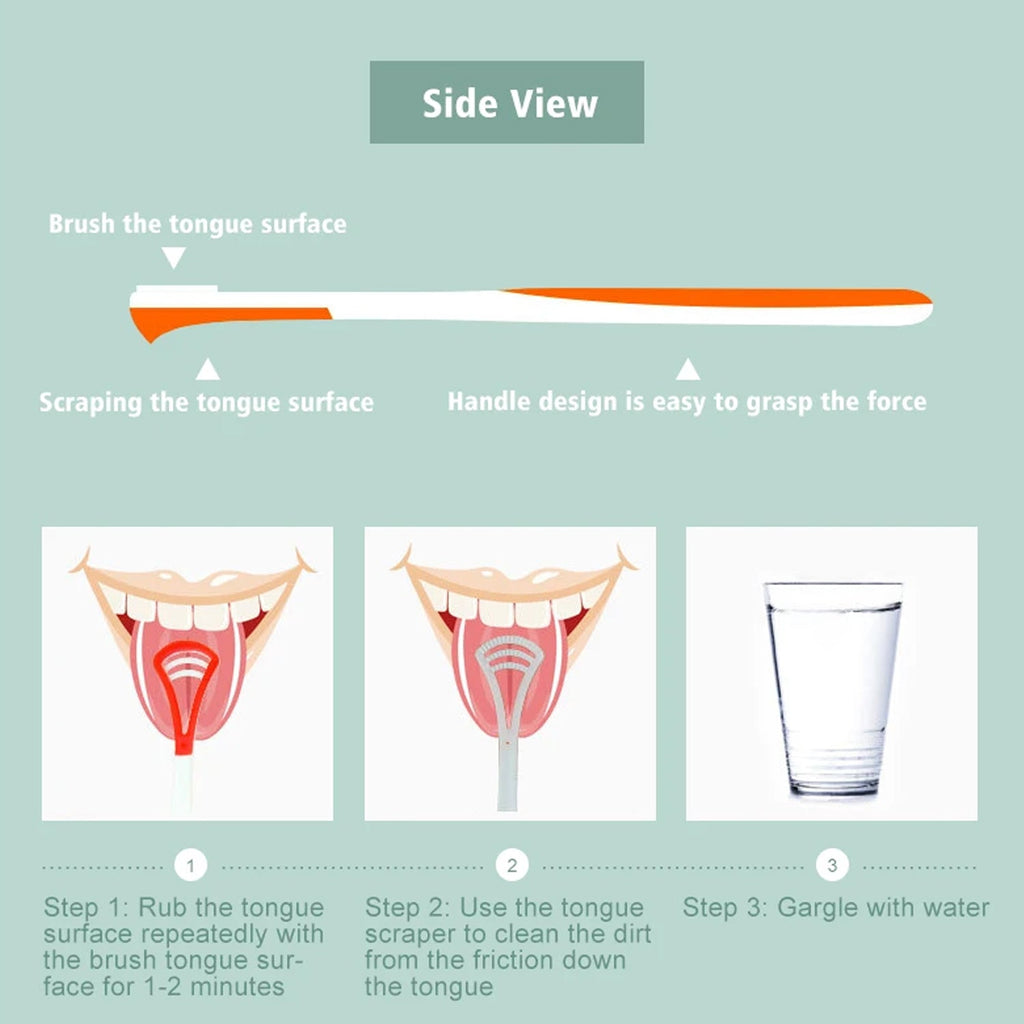 • DOUBLE SIDED AND DOUBLE EFFECTIVE: This product has a double-sided and double effective function, 1side is a smooth tongue scraper that removes most of the tongue moss from the tongue surface, and the other side is a tongue scraper brush with a protrusion that penetrates deep into the crevices of the tongue and cleans the fine stains. The two work in tandem with each other to keep your mouth fresher.